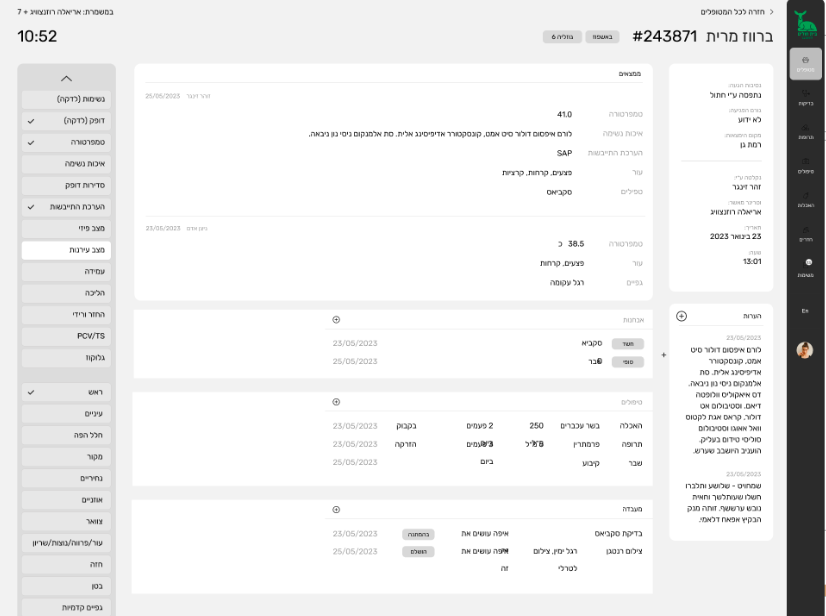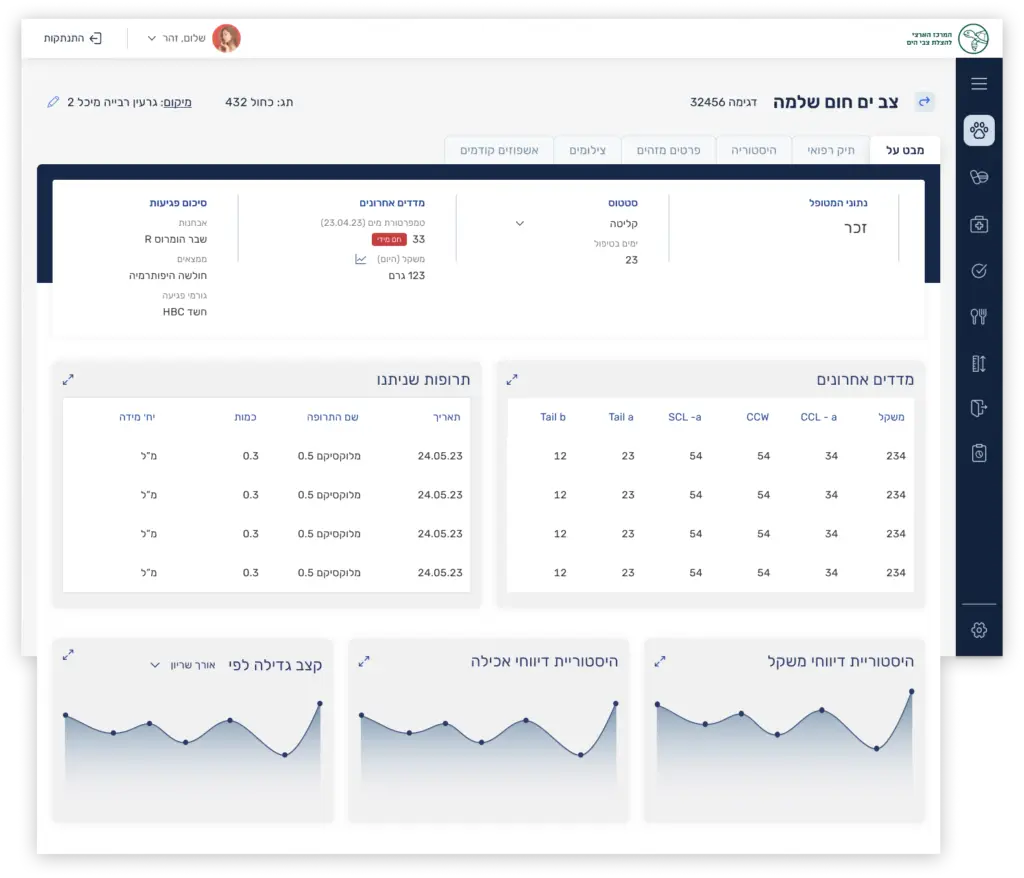עמוד מטופל- היררכיית מידע מאורגנת. תיק אישי של החיה מחולק לרמות שונות של מידע.
